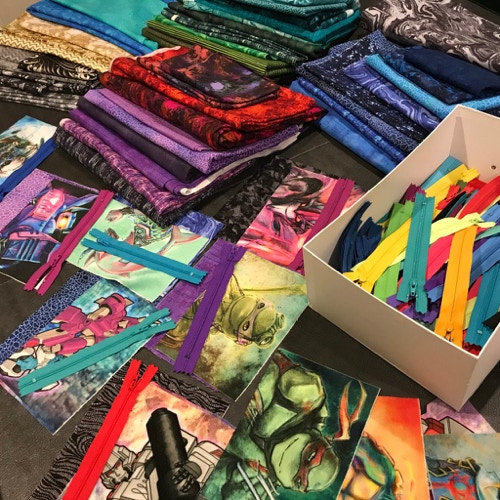Besides illustrating all of the fanart seen here, we also hand-craft most of our inventory. These hand-made items include all the sewn zippered pouches, sling bags, pillowcases and cushions: these feature our artwork printed professionally on various fabrics, which we then cut and construct by hand. We also hand-press all of the metal pins. If these show as “in-stock” that means they are ready to ship right away. (And if they are listed as “out-of-stock” we will make more as soon as we can.) All items are made in smoke-free - but pet-friendly - homes.
